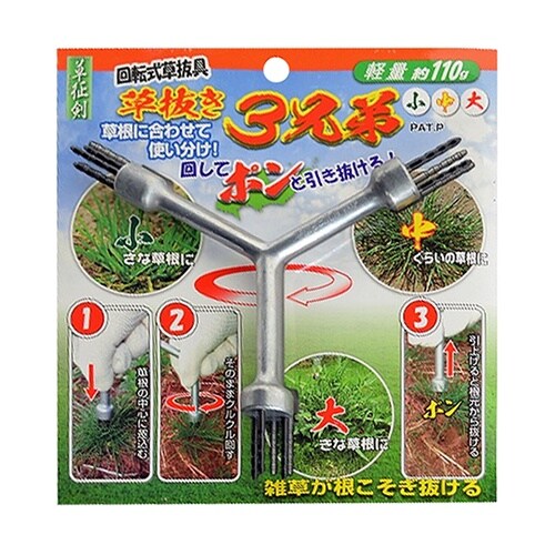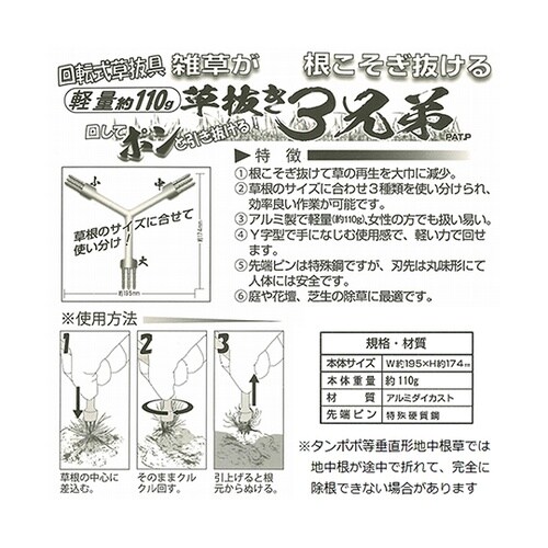 回転式草抜き具!!雑草が根こそぎ抜ける!!回して”ポン”と引きぬける「草抜き3兄弟」!!根こそぎ抜けて草の再生を大幅に軽減!!草根のサイズに合わせて3種類を使い分けられ、効率の良い作業が可能です。 |