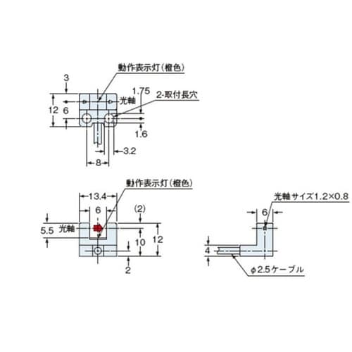 形状(mm):Lタイプ | その他仕様:直立コの字形。13.4×12×12 | 検出距離:6mm(固定) | ケーブル長:1m | 出力:NPNトラン…