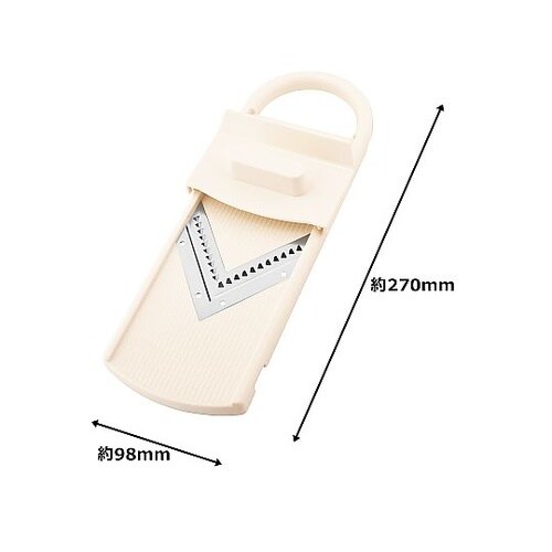 V刃で野菜の千切りが手早くでき、下ごしらえがラクラク。食材が横にすべらず、千切りができます。Vカットで食材が横にすべらず、楽々調理。小さくなった野菜もホルダーを使えば安心。ホルダー付きで安心ラクラク。 |