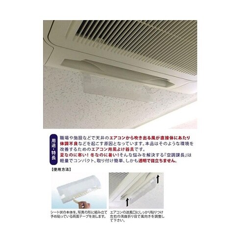 エアコンの直撃からあなたを守ります!職場や施設などで天井のエアコンから吹き出る風が直接体にあたり、体調不良などを起こす原因となっています。本品はそのような環境を改善するためのエアコン用風よけ器具です。 |