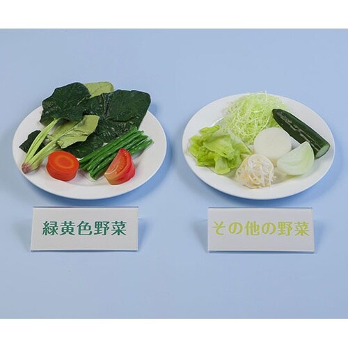 1日の野菜摂取の目標量緑黄色野菜120g+その他の野菜230g=野菜合計350gをセットにしました。1日に摂りたい野菜の量の把握、指導にお使いいただけます。 |