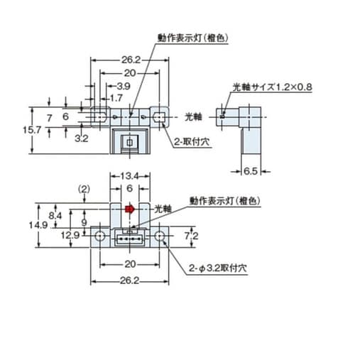 形状(mm):Lタイプ | その他仕様:直立コの字形。26.2×15.7×14.9 | 検出距離:6mm(固定) | 出力:NPNトランジスタオープン…
