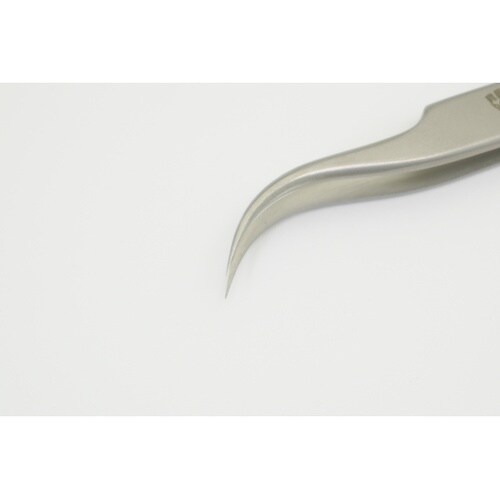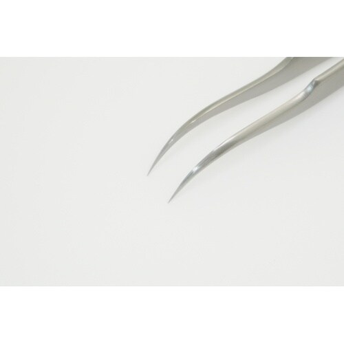 REGINE社の超精密ピンセット細いくちばし型の先端。反射を抑えたサンドブラストフィニッシュで作業中の眩しさを軽減します。 |