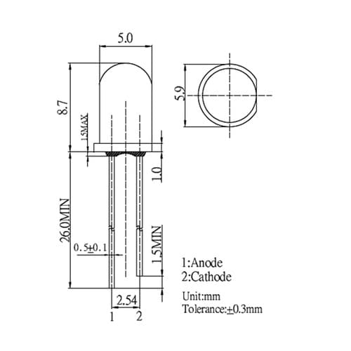 φ5mmサイズの赤外線LEDです。波長が850nmなので、暗い場所であれば薄っすらと赤い光が見えます。IrDAや赤外線カメラ、投光機などに適しています。 |