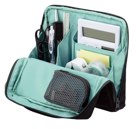 収納できる小物はペンや電卓、付箋、修正テープなど、仕事に必要なものが入ります。コンパクトになるのでバッグにも入れやすく、準備や片づけもスムーズに行えます。