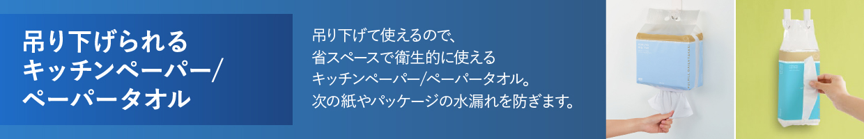 壁に吊り下げ可能で、省スペース&衛生的なキッチンペーパー。キッチンや給湯室をスタイリッシュに。1枚ずつ簡単に取り出しやすいシートタイプ。2穴に掛けることで吊り下げが安定します。