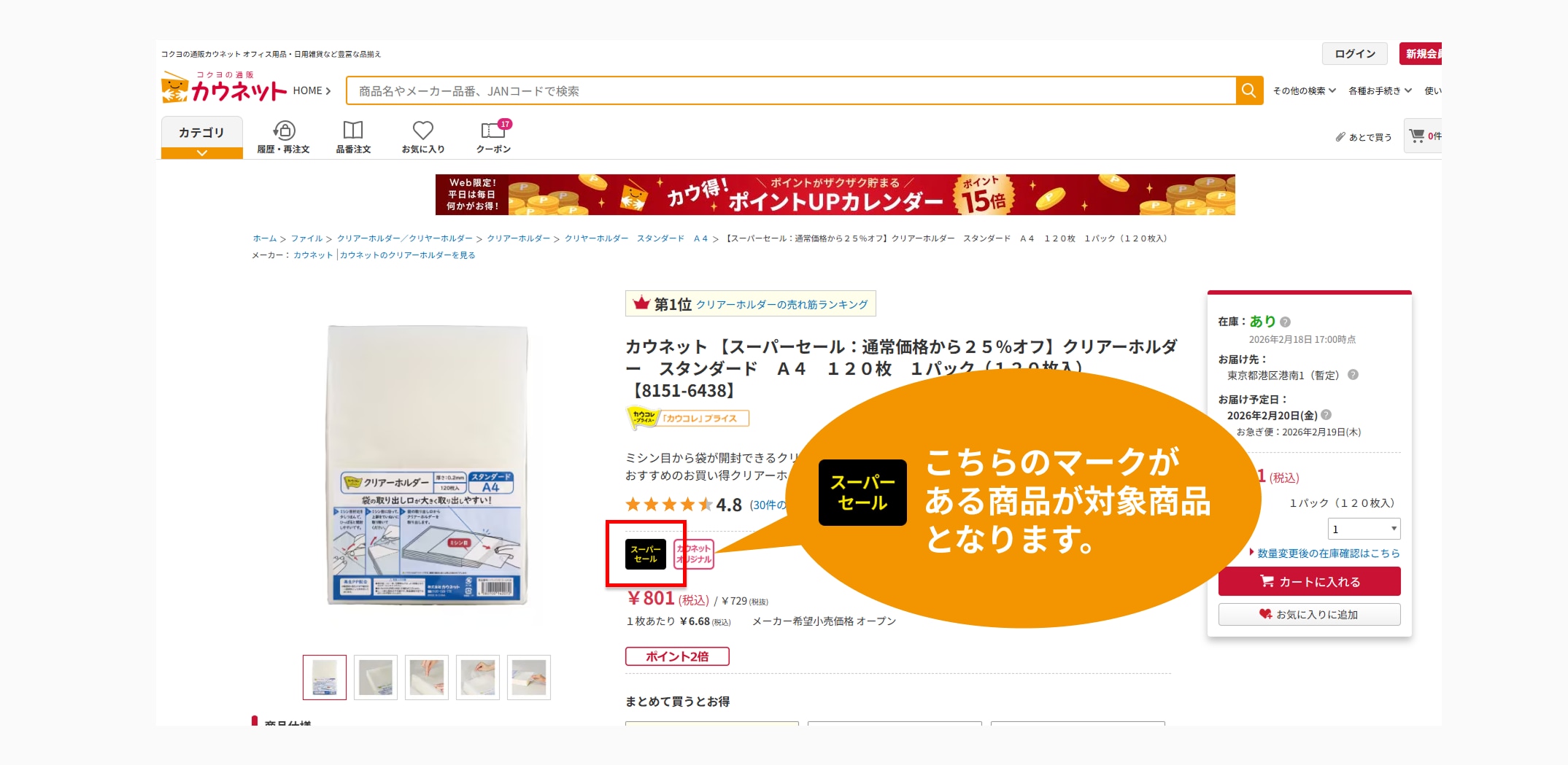 ※通常価格は 2026年2月15日時点でのカウネットサイトでの販売価格です。 ※コピー用紙は 期間限定販売となります(2月16日〜3月16日予定)。販売状況に応じて、購入制限を設けさせていただく場合があります。 ※人気メーカーのスーパーセール対象期間は、 2月24日〜3月31日となります。 ※FAXでのご注文も可能です。 対象商品の確認方法