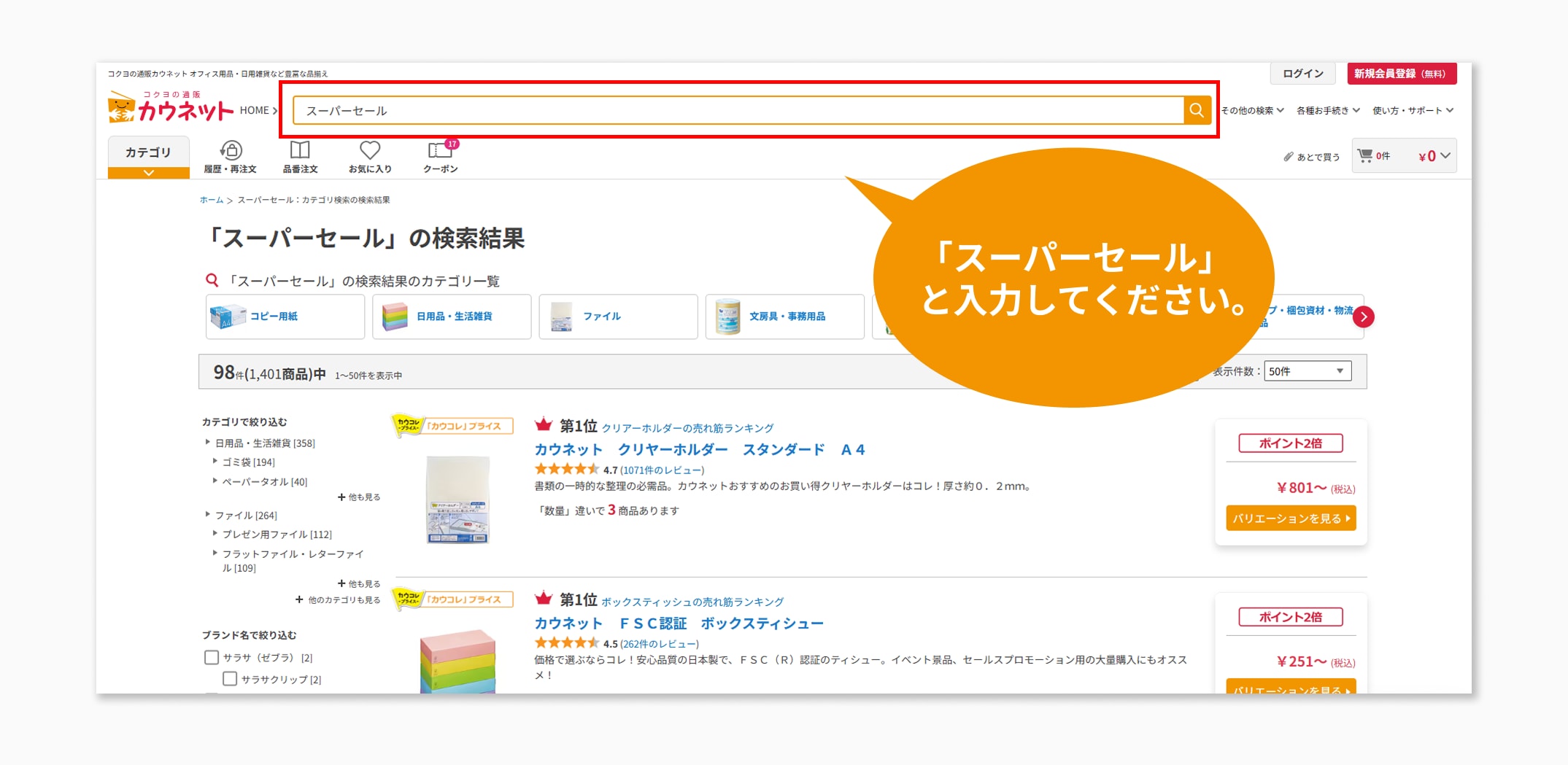 平素はカウネットをご利用いただきありがとうございます。 カウネットでは、値上げ基調の市場の中、少しでもお客様にお買い求め頂きやすいように法人会員様向けに 「カウネットスーパーセール」 を2月16日より開催しておりますが、 2月24日火曜より、「カウネットスーパーセール」の第二弾として、人気メーカーの商品約1,600品番を、特別価格にてご提供を開始する予定です。 また、カウネットオリジナル商品も約600品番を追加する予定となっております。 この機会にぜひ、お客様のお買い物にお役立てください。 「カウネットスーパーセール」の概要第一弾 <開催中>カウネットオリジナル商品をお買得価格で〜2月16日(月) 約1,400品番 2月24日(火) 約600品番の商品を追加いたします。 なお、スーパーセールの終了時期につきましては、現時点では終了時期が未定です。 予告なく終了する場合がございますので、ご了承ください。 第二弾 人気メーカーの商品をお買得価格で〜2月24日(火)〜3月31日(火)まで カウネットスーパーセール特設ページ ※特設ページは2月24日(火)12時頃公開を予定しております。 【掲載予定商品を一部ご紹介】 <2月24日掲載商品>