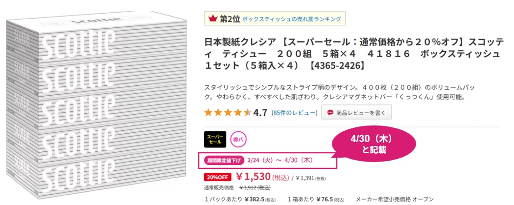 平素はカウネットをご利用いただきありがとうございます。 カウネットでは、値上げ基調の市場の中、少しでもお客様にお買い求め頂きやすいように法人会員様向けに 「カウネットスーパーセール」 を開催しておりますが、 ご好評につき、2月24日(火)より、特別価格にてご提供中の人気メーカー商品(約1,700品番)のうち、一部商品について 4月30日(木)まで期間を延長して販売させていただきます 。 一部、3月までのお値下価格から価格が変更となる商品もございますが、 いずれ4月30日(木)までは通常価格よりお買い得な価格にてご提供いたします。 なお、3月31日(火)をもって特別価格でのご提供が終了となる商品もございますので、あらかじめご了承ください 。 ※値下げ期間を4月30日(木)まで延長している商品については、商品詳細画面の「期間限定値下げ期間」の日付が以下のようになります。 (日付の延長は、3月25日(水)以降となります。)