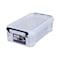 積み重ねできる丈夫な収納ボックスです。A4用紙がすっぽり入るサイズ感です。工具収納から押し入れ収納まで、様々なシーンで使えます。フタを固定するストッパー付きです。中身が分かりやすいクリアタイプです。