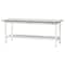25mmピッチで取り付け高さ変更可能な中間棚付き!取りやすい位置にワークを収納でき作業効率アップ!全体均等耐荷重300kgの軽量作業台です。立ち作業台におすすめの高さ900mm。天板種類は3種類、ポリエステル天板、塩ビシート天板、スチール天板をご用意。作業場所や用途に合わせ、豊富な天板サイズからご選定いただけます。足元のツナギ(カンヌキ)は後方にも取付可能で、天板下の空間を有効活用でき便利です。工場や倉庫、オフィスでの梱包、検品、検査、組立、仕分け作業等に。