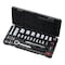 差込角1/4DR(6.3mm)のソケットで、サイズの異なる13点組みのセットです。ソケットの全高が低く、エンジンルームなど特に狭い場所での作業に役立ちます。ボルトナットを傷めにくい面接触タイプです。