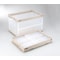 側面から中身が確認できます。ふたには簡易ロックがあり、ロックすればあやまってふたが開くのを防止します。持ち手は持ちやすいアーチ状。短側面の上枠とフタ中央はシボ加工でシールがきれいにはがせます。+もっと見る
