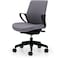 背・座一体型のきれいなフォルムのファブリックチェアです。スチールフレームをデザインアクセントにしています。キャスター付き回転チェア。上下昇降機能付き。