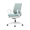 優しい生地感と白フレームは空間を明るく演出。女性でもしっかりフィットするサイジング。背面は包み込むようなフォルム、裏側はメッシュで通気性がよく見た目も軽やか。座面はもっちりとしたモールドウレタン採用。