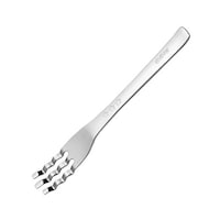 縦・横3次元の動きに対応したグリップデザイン。すくい(横)、あげる(縦)2つの動作が流れるようにスムーズ。麺類をすくうのに便利な「ツノ」付き。一体成型で溝やヘコミがないため洗いやすく衛生的。握り幅が広