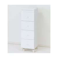 連結金具・転倒防止部品付。洗面所やキッチン、リビングの狭い場所を有効利用できる「すきま収納」です。タオル用の棚は上にのせたタオルを下から引き出すことができます。横並びに置くこともできます。
