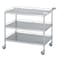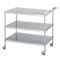 組立式。耐食性に優れたSUS304製ワゴン。三段式。片側ハンドル。中棚・下棚位置変更可(25mmピッチ)