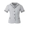 配色のボタンとトリミングがアクセントの夏向けオーバーブラウス。凸凹感のあるツイード調の素材を使用し、通常の生地よりも涼しく感じられて、清涼感があります。幅広い職種や年齢の方が着用可能です。