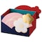 華やかなデザインのボックスです。ハンドル付で手に取りやすく大きく見せることができます。簡単にセットできてアクセントになる赤いワイヤータイのリボン付です。