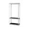 メタルフレームと木目調ボードのオープンラック。ボードはナチュラルとダークブラウンのリバーシブル仕様で、フラットにもサイドバー付きにも取付可能。ボルトレスのシンプル構造。ハンガーバー付き。