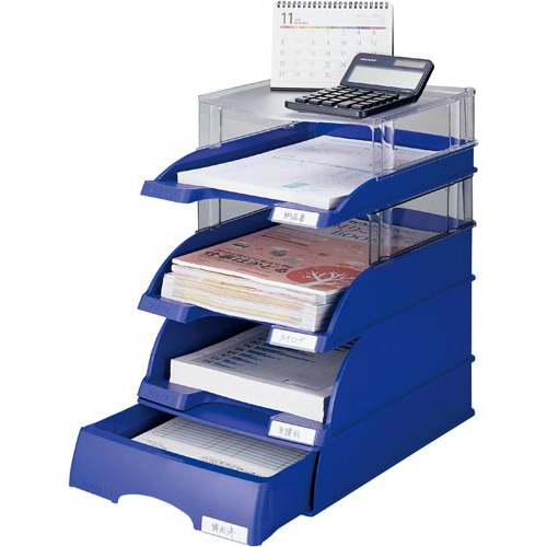 上部が安定しているので携帯などの置き場所がない小物置きとしてスペース有効活用!トレーの間に設置すれば、収容スペースが約6cmアップでカタログやコピー用紙の保管場所にも。レタートレークリアと好相性!